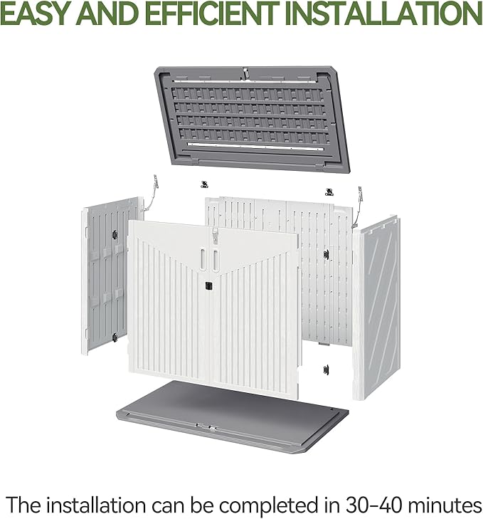• Installation and delivery: This plastic storage shed has been optimized many times to achieve a simpler installation with fewer screws, which takes only 30-40 minutes for 1-2 people to install. This tool room has 2 packages, you may receive at different times, thank you for your patience