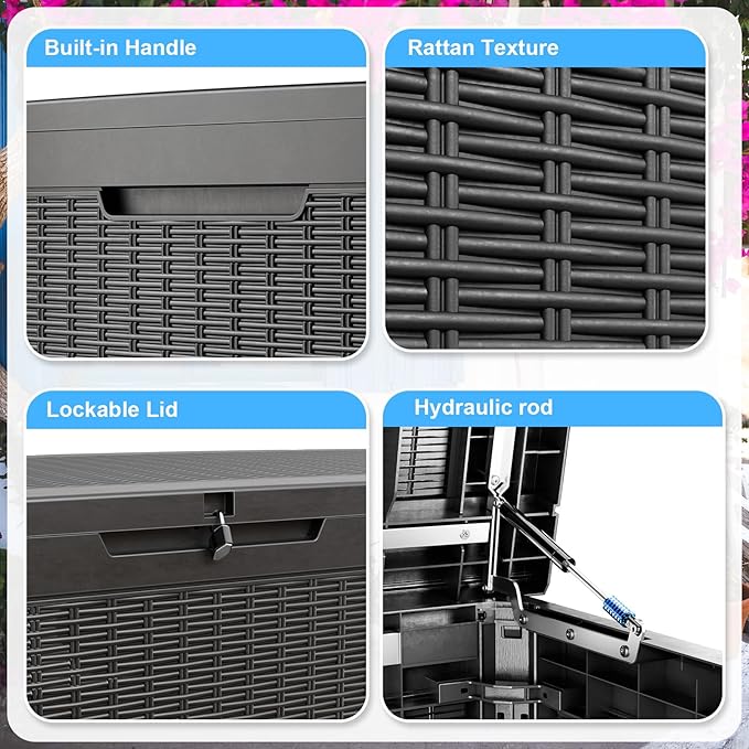 • Safety design: Each deck box has lockable holes (not included) for added security; in addition, the box is equipped with a hydraulic stand, which allows easy opening and slow closing and prevents hand pinching. The outdoor waterproof deck box has built-in handles on both sides, ensuring easy grabbing and moving