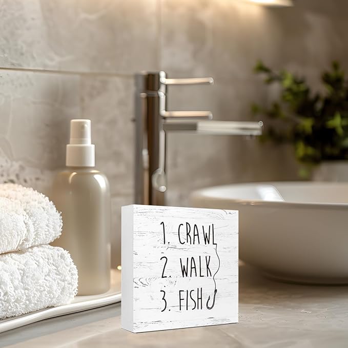 White Crawl Walk Fish Rustic Wooden Sign Desk Decor, Funny Baby Fishing Wood Block Sign for Home Bedroom Baby Room Shelf Table