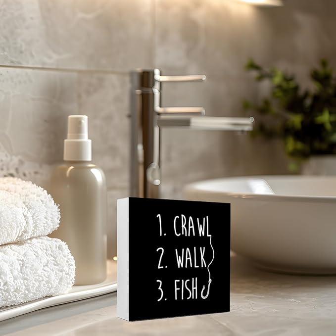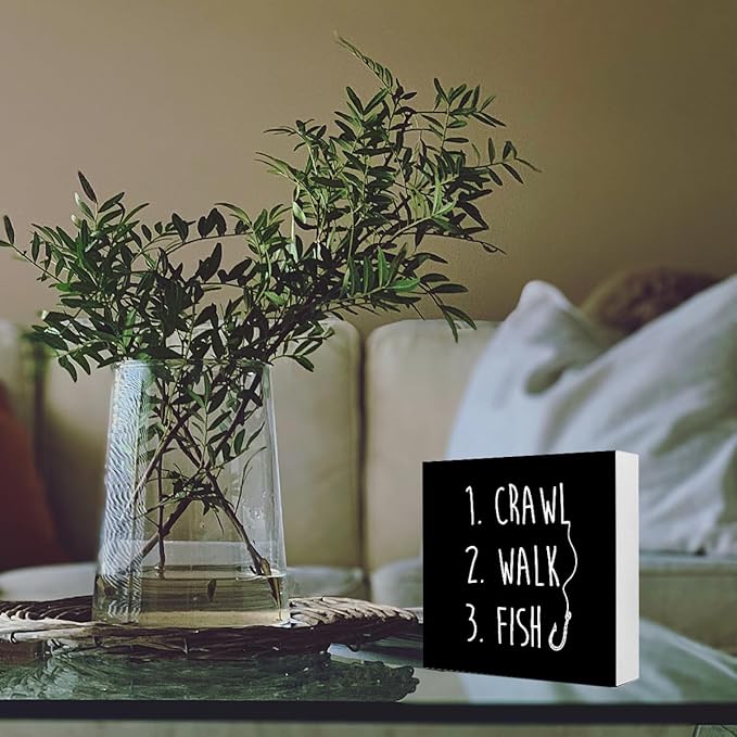 Black Crawl Walk Fish Rustic Wooden Sign, Funny Baby Fishing Wood Block Desk Decor for Home Bedroom Baby Room Shelf Table