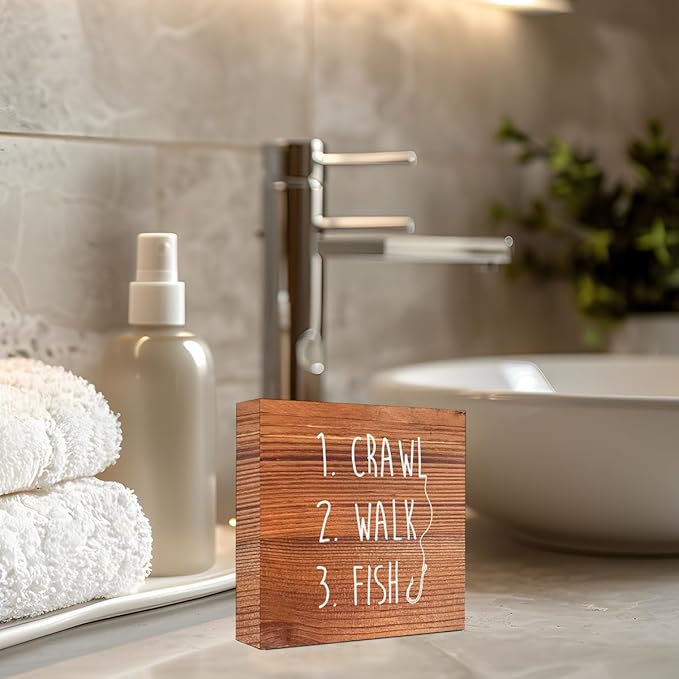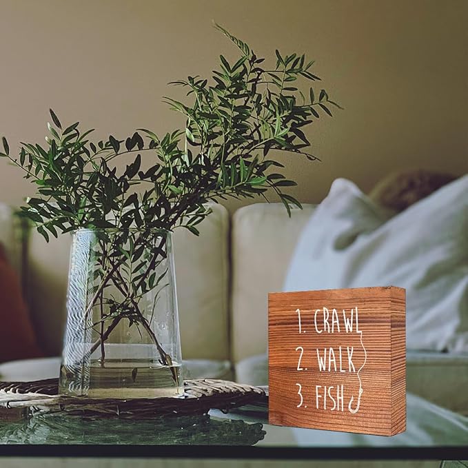 Brown Country Crawl Walk Fish Rustic Wooden Sign Desk Decor,Funny Baby Fishing Wood Block Sign Desk Decorations for Home Bedroom Baby Room Shelf Table Decor