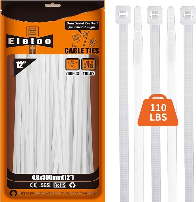 • 【Details】 Dimensions: Length: 12" | Width : 0.19" | Max Dia: 3" |Tensile Strength: 110lbs | With Eletoo zip ties, you don't have to worry about The quality of the zip ties.