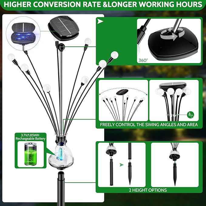 • Unique design: Our solar garden lights have 9 larger and brighter LED premium firefly bulbs, besides the 9 firefly bulbs, there is an illuminating LED light at the bottom which is composed with 6 LED bulbs with warm white lighting to illuminate the pathway. The solar panel is on the top of the lights, which can be rotated in 360° and adjustable to aim at the sky for maximum sunlight absorption.
