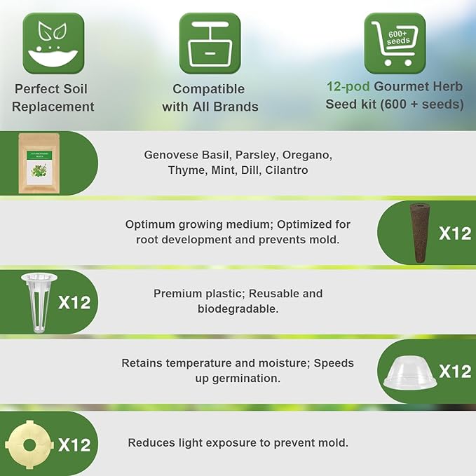 Gourmet Herbs Seed Pod Kit for AeroGarden, iDoo, Ahopegarden, MUFGA Hydroponics Garden with Basil, Parsley, Thyme, Mint, Cilantro, Dill, Oregano - Compatible with All Hydroponics (12-Pod)