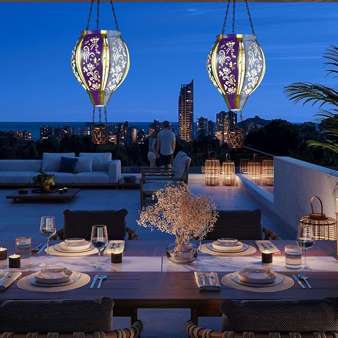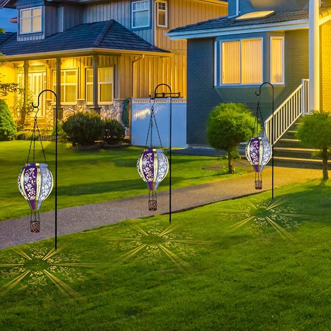 • 【Metal Hot Air Balloon Solar Lantern】The metalwork is not only decorative but also allows light to filter through, casting intricate shadows and creating a mesmerizing play of light and darkness in your garden or patio. This outdoor hanging solar lantern showcases intricate floral and swirl patterns, lending elegance and depth to its design.
