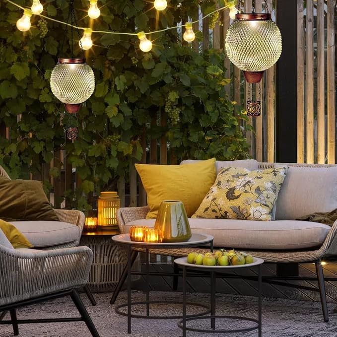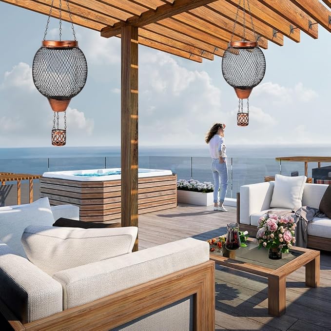 • 【Hot Air Balloon Solar Lantern】This outdoor hanging solar lanterns features a distinctive design with a metal mesh exterior that exudes a vintage charm. The cage shpe creates a delicate effect, allowing light to filter through and cast beautiful shadows.