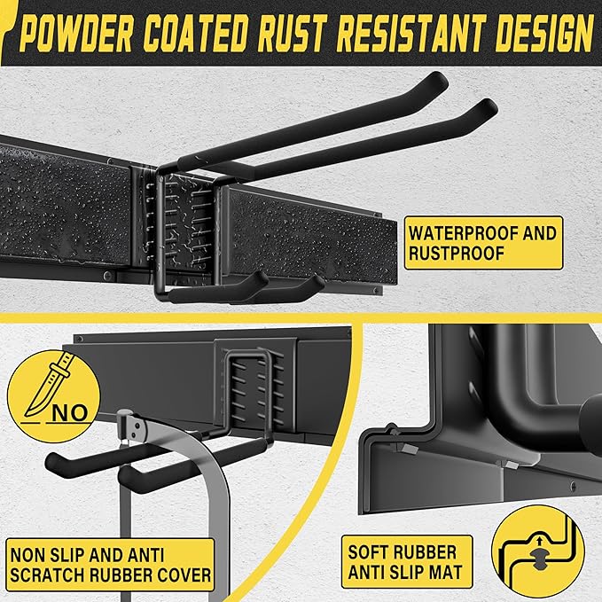 • VERSATILE TOOL RACK:Our Garage Storage System Isn't Just for Your Garage Tools;it’s Perfect for Arranging Garden Tools,Brooms,Hoses,and Even Sports Equipment Like Hockey Sticks And Ski Gear.This Multifunctional Storage Solution Maximizes Your Space.