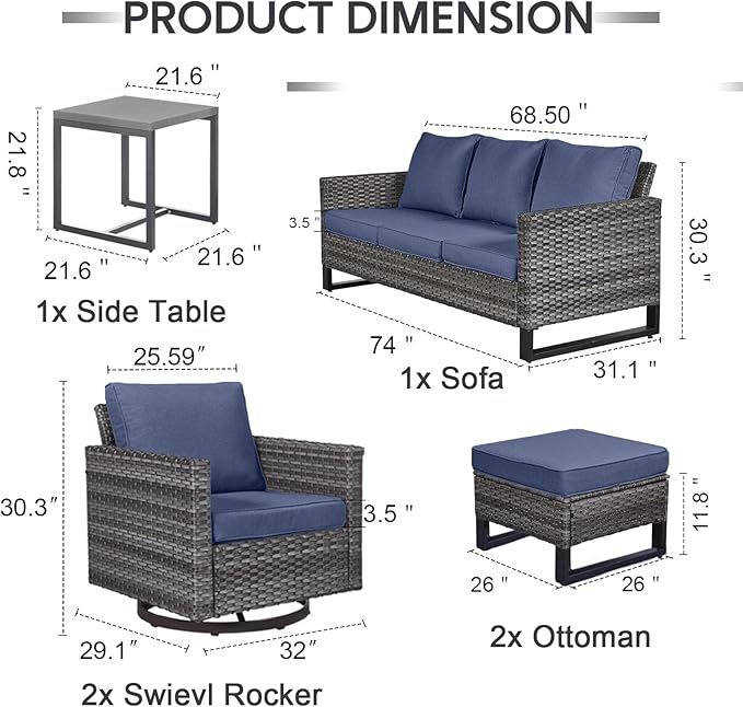 • 6 Piece Patio Furniture Set - Our ooutdoor furniture focuses on providing a superior comfort experience. Includes 2 outdoor swivel rocker chairs, 2 ottomans, a side table and a 6 seat sofa to provide you with an unrivalled outdoor seating relaxation experience. Whether you're reading, chatting, or enjoying the view, you can enjoy the great outdoors with this patio furniture