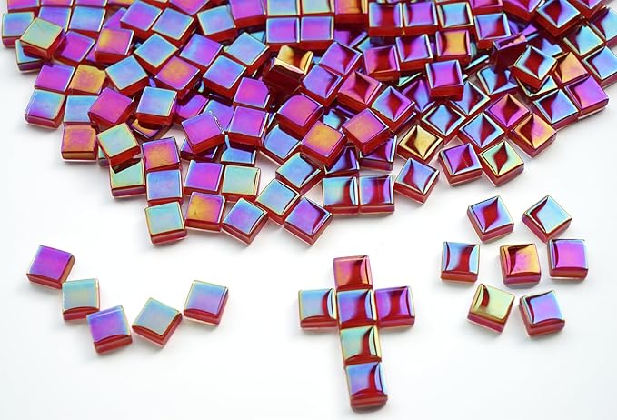 • Iridized Vibrant Glass Tiles: These vivid red tiles for mosaic supplies feature a stunning iridescent finish that creates a beautiful play of colors, adding sparkle to your next mosaic DIY project
