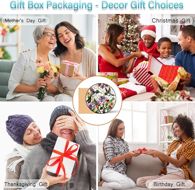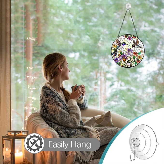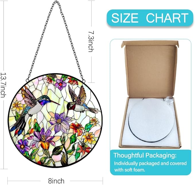 • Glass Art Window Decorations: The upgraded large-size stained glass hanging panels bring you a new decorative experience. This is a very beautiful hummingbird sun catcher hanging, size is 8 inches which is perfect for any windows, wall or garden space. Stain glass window hanging is the right size to enhance your home decor without blocking the view, it is a good choice for decorating a house