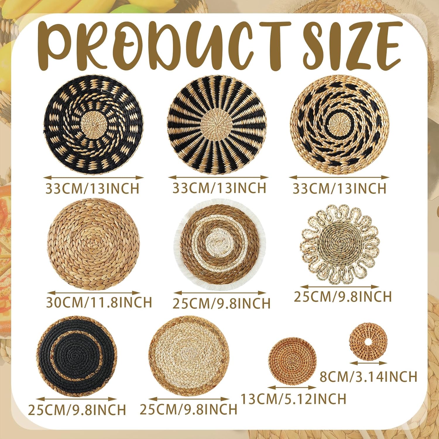 • Different Sizes: the woven wall basket measures approx. 3.15 inches/ 8 cm, 5.12 inches/ 13 cm, 9.84 inches/ 25 cm, 12.99 inches/ 33 cm, in diameter, which different sizes help you to make scattered layout, to bring you an unexpected visual effect