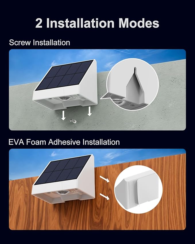 • Simple Installation Methods in 1 Minute: Easily installable within one minute on surfaces such as wood, metal, or concrete. Solar deck light can be securely mounted using the provided screws or EVA tape, suitable for various scenarios like fences, cement walls, wooden walls, meeting the installation requirements of different environments.