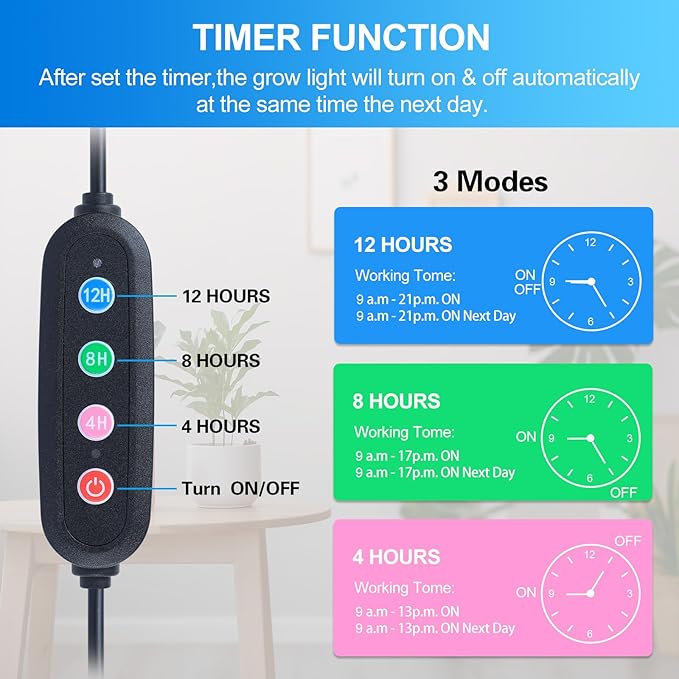 • Timer for Auto On/Off Plant Grow Light---4/8/12H Timer Grow Lights for Indoor Plants. Auto On/Off Every Day Just as You Need.