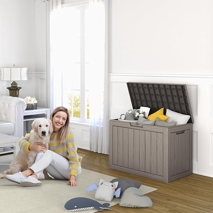 • TRANSFORM YOUR SPACE: Whether used indoors as a laundry storage solution or outdoors for patio items like cushions, garden tools, and sports gear, this patio storage box excels. Its multi-functional design makes it suitable as a side table, patio seat, storage bench, or footstool