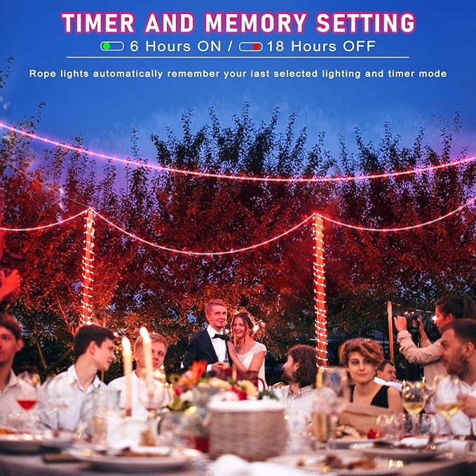 • 【Waterproof Outdoor String Lights】- IP65 Waterproof design, they are suitable for all weather use, remaining bright and sparkling even during strong rain and windy days. The outdoor rope lights is ideal for year-round outdoor decor and can illuminate gazebos, canopy, corridors, gardens, and patios. But please note the plug is not waterproof.
