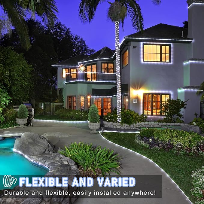 • 【Safe and Reliable】- The Christmas lights outdoor is covered with a transparent and thick PVC tubes that allows full 360° all-round lighting, delivering a full and even lighting experience. Plus, the 100ft rope lights feature a UL-certified 30V low-voltage power adapter. It won't overheat for a long time of use and is safe for kids and pets.