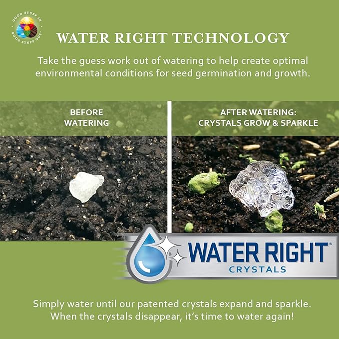 • The Right Amount of Water at the Right Time When it comes to growing plants, the right amount of moisture makes all the difference. Our patented Water Right Crystals provide an ideal guide for when and how much to water. Simply water until the crystals expand and sparkle. When the crystals disappear, it’s time to water again!