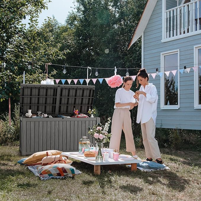 • BEAUTY MEETS DURABILITY: Featuring an aggregate resin with a wood grain pattern, this deck box offers an appealing look coupled with robust protection. It's resistant to water, UV rays, fading, rust, peeling, and warping, making maintenance nearly unnecessary for the coming years