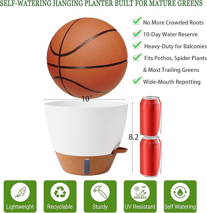 • Note: This large hanging planter features a 10-inch wide opening (comparable to a basketball's diameter) and stands 8.26" tall (about the height of two standard soda cans). Designed specifically for mature plants like spider plants and pothos, it is not recommended for small succulents or tight spaces. Always measure your current pots or intended placement area before purchase to ensure the dimensions meet your needs.