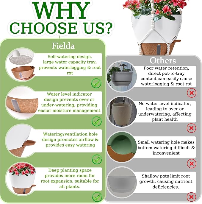 • 【Never Over/Underwater Again!】Fielda's indoor hanging planters feature an EXCLUSIVE WATER WINDOW in the base tray - instantly check moisture levels without guesswork! Protect your plants from dehydration and promote healthy root systems with this visual watering guide. Perfect for hanging pots for indoor plants enthusiasts who value scientific plant care.