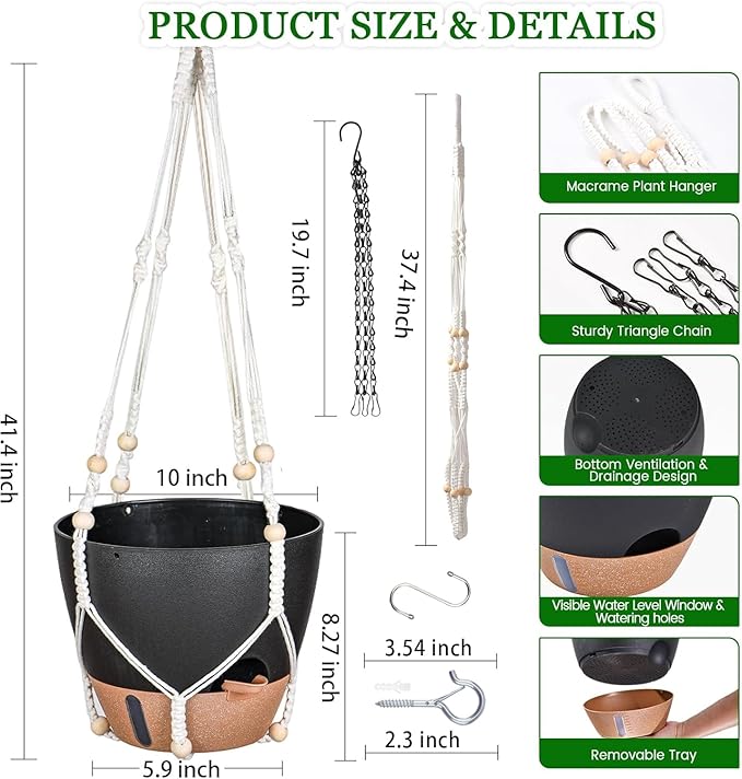 • 【Smart Self-Watering System】 Our hanging plant pots come with a REMOVABLE RESERVOIR TRAY that stores 7-10 day water supply. Absorbent cotton ropes automatically deliver moisture to soil when needed - ideal for vacations or busy lifestyles. Spend less time watering hanging baskets for indoor plants!