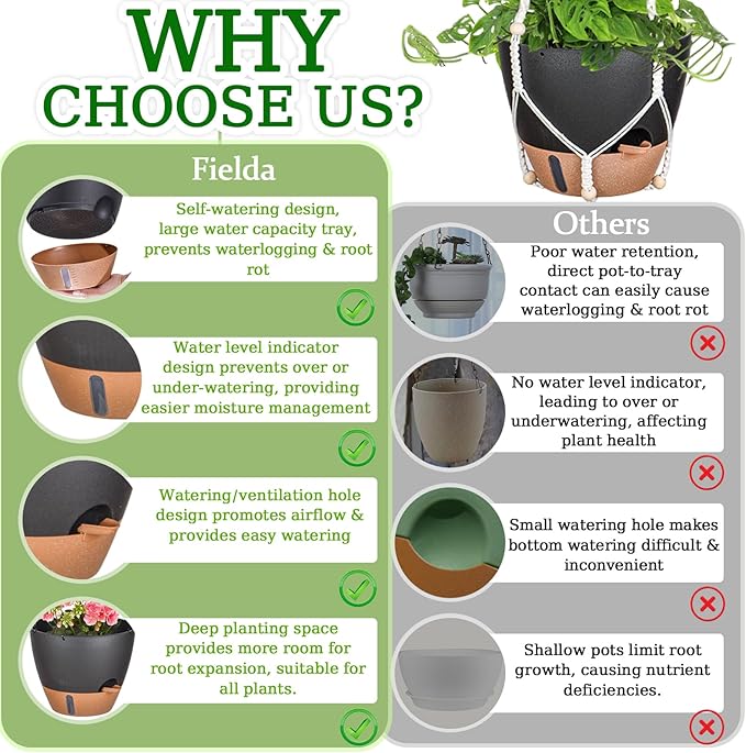 • 【Never Over/Underwater Again!】Fielda's indoor hanging planters feature an EXCLUSIVE WATER WINDOW in the base tray - instantly check moisture levels without guesswork! Protect your plants from dehydration and promote healthy root systems with this visual watering guide. Perfect for hanging pots for indoor plants enthusiasts who value scientific plant care.