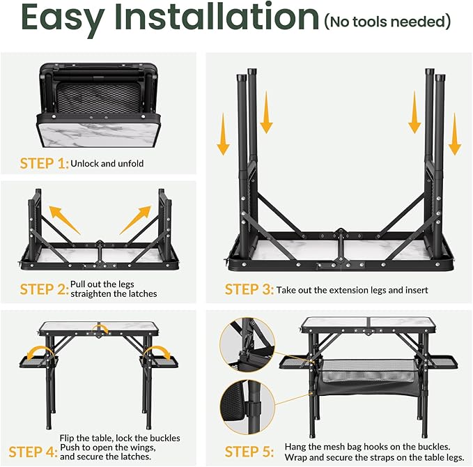 • Lightweight & Strong Load-bearing. Our folding camping table is made of 90% aluminum & 10% density board, ensuring that it is light and strong at the same time. The picnic table is 6lbs heavy and the tabletop supports up to 70 lbs. Each wing supports up to 20 lbs and the storage bag can hold lightweight items not more than 11lbs for long-term use.