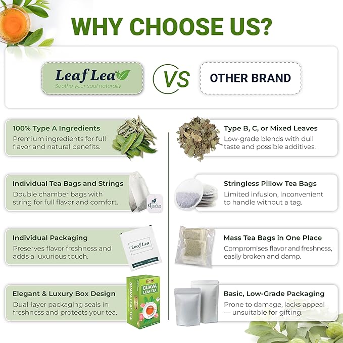 • 100% Natural Guava Leaves – Our LeafLea Guava Leaf Tea Bags are made from carefully selected, high-quality guava leaves, providing a pure, natural tea experience. These guava leaf tea bags are free from artificial additives, sugar, caffeine, and gluten, perfect for those seeking a healthy and wholesome beverage that supports overall wellness.