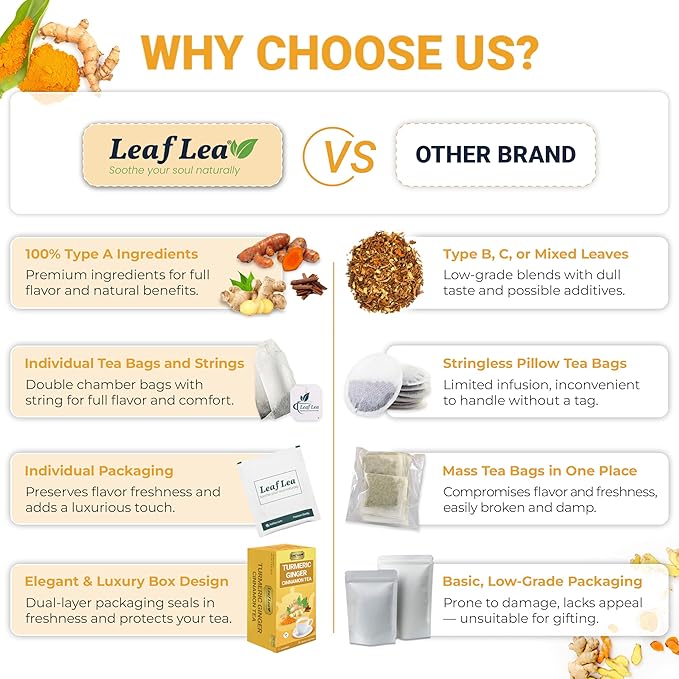 • Sustainable & Luxurious Design – Our turmeric ginger tea bags are made from paper materials that enhance tea flavor diffusion. Each turmeric and ginger tea bag is individually wrapped in a foil-lined paper bag to lock in freshness and aroma. Packaged in a beautifully designed, sturdy paper box, this premium product makes a perfect gift for health-conscious individuals who appreciate quality and style.