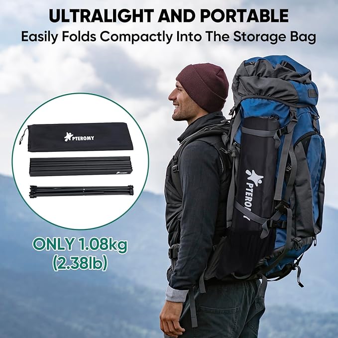 • Ultralight and Portable: PTEROMY Small camping folding table features a waterproof aluminum tabletop and frame, making it lightweight, rust-resistant, and easy to clean; It folds compactly into an included Oxford cloth storage bag, ensuring effortless portability for all your outdoor activities