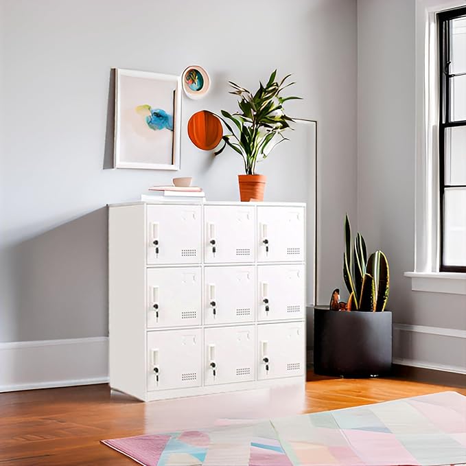 Student Locker Organizer, Multi-Door Steel Locker, Small Locking Cabinet Storage Organizer, Office File Cabinet, Home Locker, Gym Locker, Metal Storage Locker - Gray and White (9 Door, White)