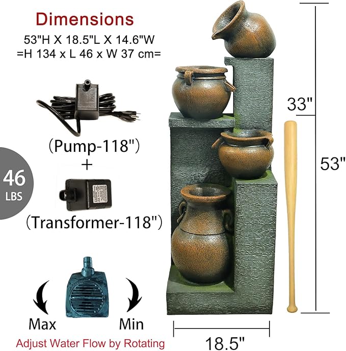• Durable Design with Safety Guarantee: The Tall garden water fountain is made of High-quality resin materials, which is resistant to heat, wind and rain, without worrying about short-term breakage. UL Certification, 30 Days Hassle-Free Returns, 1-Year Warranty. If You Have Any Problems About The Yard Water Fountain Or Need Any Other Support, Please Feel Free To Contact Us Through Amazon, We Will Respond Within 16 Hours.