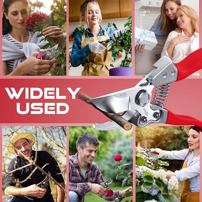 • FEMALE & ELDERLY-FRIENDLY: The ergonomically designed, non-slip rubber handles reduce hand fatigue and ensure a comfortable, stable grip. The cushioned design minimizes wrist and hand strain, making these pruners ideal for long use and for those with arthritis or anyone needing extra comfort