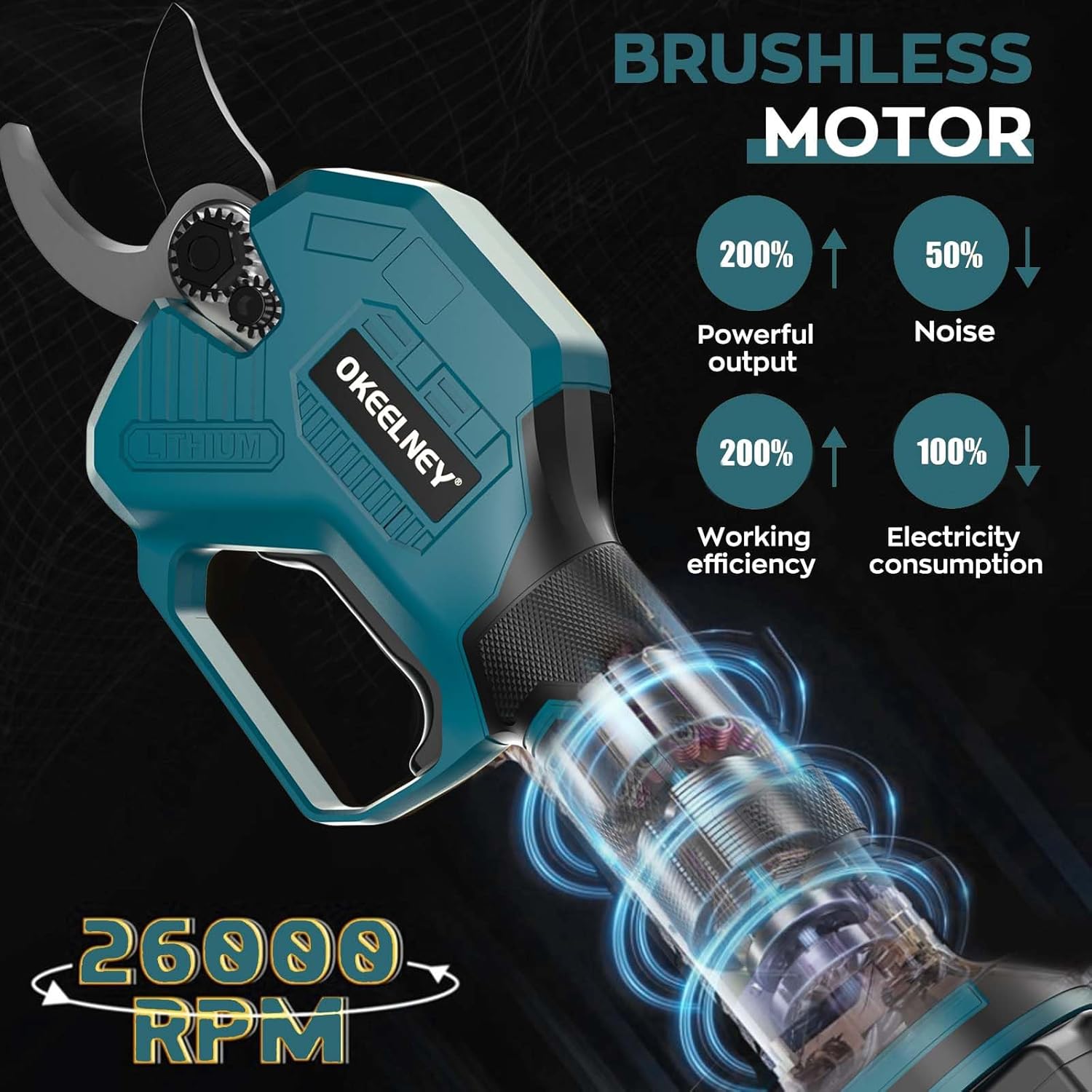 • 【Brushless Motor & Swiss SK5 carbon steel blade】Okeelney cordless Pruner integrates Swiss-grade SK5 high-carbon steel blades with corrosion-resistant non-stick coating and a high-torque brushless motor system, delivering precision cutting capacity up to 1.5inch branch diameter while ensuring zero jam operation and extended durability