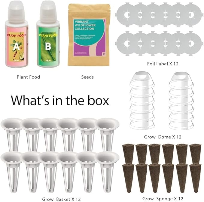 • 【All-IN-ONE Home Garden】These hydroponic pods provide everything you'll need to start your indoor home garden. 7 types of 350+ vibrant wildflower seeds, 12 growing sponges, growing baskets, growing domes and pod labels, 200ml A&B plant food. It's suitable for both beginners and experienced gardeners