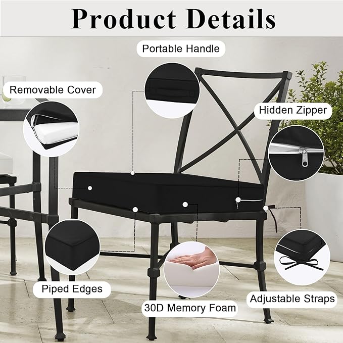 • PERFECT SIZE: Outdoor chair cushion set includes 2 cushions. Cushions measure: 22 inch (W) 22 inch (D) 4 inch (H). Fits most standard size outdoor chairs. Since the outdoor cushions are vacuum-packed, it may take 24-52 hours for the cushion foam to fluff back up after opening the vacuum bag