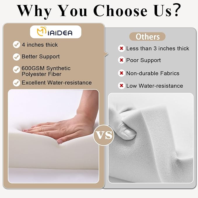 • HIGH RESILIENCE FOAM SUPPORT:We use thicker 4 inch high resilience premium foam, super soft and comfortable. Premium sofa level hardness provides excellent elastic support and effectively relieves pressure on your body. Reduce the pain of lumbar, back and hip. MJIAIDEA Outdoor furniture cushions are not easy to deform after sitting for a long time