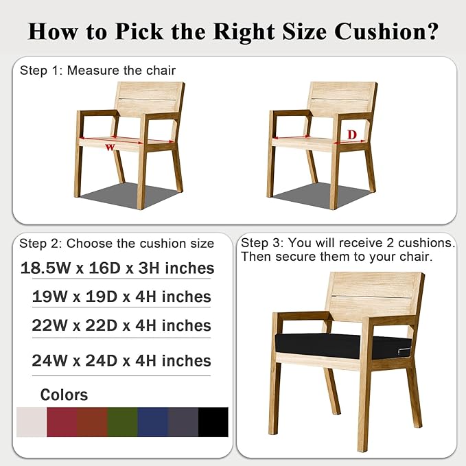 • PERFECT SIZE: Outdoor chair cushion set includes 2 cushions. Cushions measure: 24 inch (W) 24 inch (D) 4 inch (H). Fits most standard size outdoor chairs. Since the outdoor cushions are vacuum-packed, it may take 24-52 hours for the cushion foam to fluff back up after opening the vacuum bag