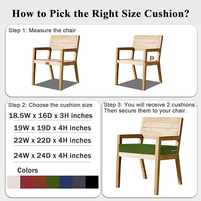 • PERFECT SIZE: Outdoor chair cushion set includes 2 cushions. Cushions measure: 24 inch (W) 24 inch (D) 4 inch (H). Fits most standard size outdoor chairs. Since the outdoor cushions are vacuum-packed, it may take 24-50 hours for the cushion foam to fluff back up after opening the vacuum bag