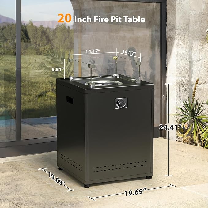 • Portable Fire Pit Table: The size of the 20" propane fire pit table is 19.69*19.69*24.41 inches, 46.2 pounds, it is very portable and easy to move, suitable for some places such as outside patios, porches, decks, etc.
