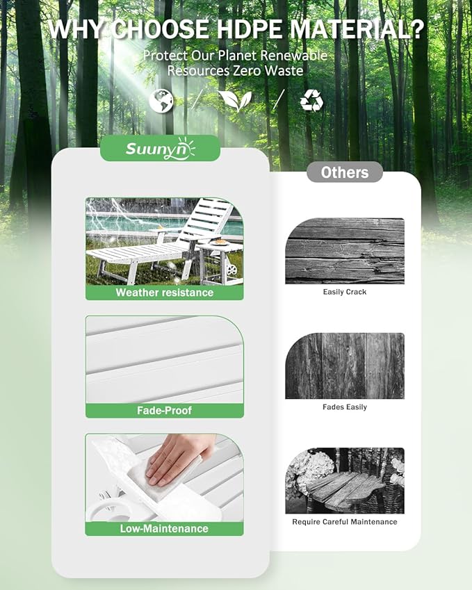 • Premium Suunyn HDPE: The polywood chaise lounge are made from high-density HDPE, which bends slightly under heavy weight or high temperature but returns to its original shape when the weight is removed or the temperature has dropped. This durable material withstands harsh weather and is easy to clean