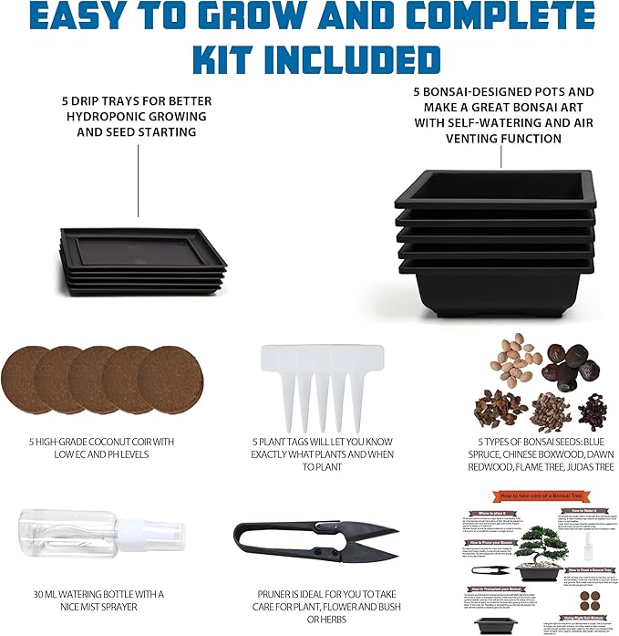 • KIT INCLUDES: 5 types of bonsai tree seeds, 5 plastic pots with drip trays, 5 soil discs, 5 plastic writable plant markers, 1 bonsai pruner, a mini tweezer, a small water bottle and a gardening guide.