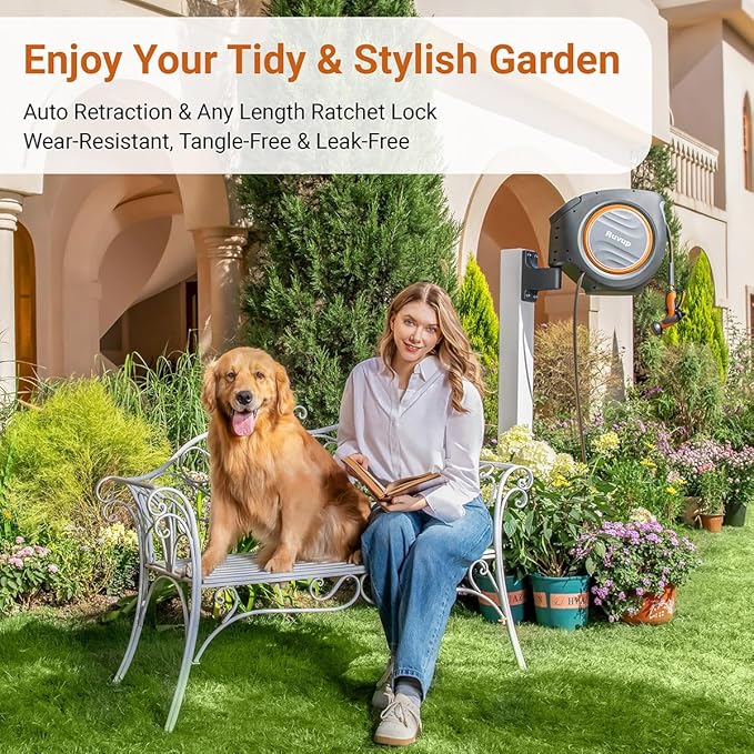 • Effortless Auto Retraction: With a retractable hose reel lifespan of more than 20,000 cycles, enjoy the convenience of smooth and automatic retraction every time. After watering, just put gently on the hose and the reel will automatically retract the hose smoothly back into the casing, without any tangling and twisting.