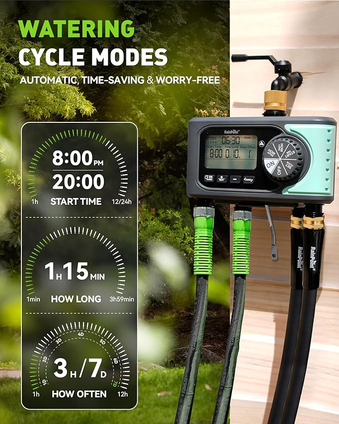 • 3 TIMED WATERING CYCLE MODES - This 4 zone water timer for garden hose can be flexibly set start time in 12-hour or 24-hour format, watering duration from 1-3 hours 59 minutes, and watering frequency in every 8 hours, every 12 hours, or every 1~7 days. Don't worry about no one watering plants anymore, travel with confidence.