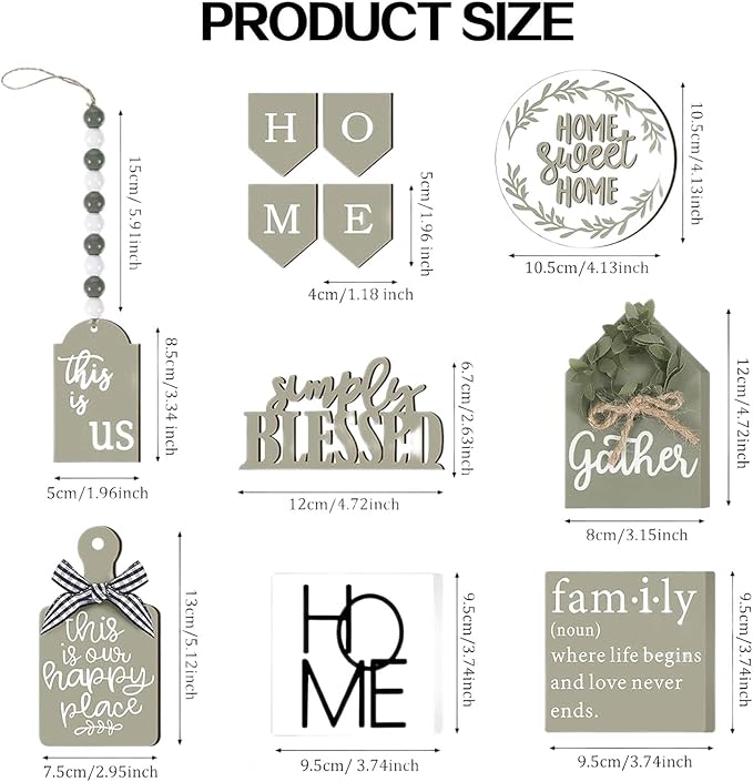 • COMPLETE 11-PIECE DECORATION PACK:A carefully curated set of 11 rustic farmhouse decorative items for adorning your tiered tray or shelf. It includes a variety of wooden mini signs, beaded garlands with tassels, artificial green plants, etc. (The tray is not included).