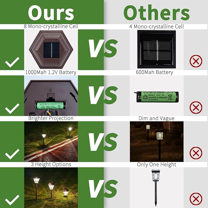 • [UPGRADED SOLAR OUTDOOR LIGHTS]: The solar pathway lights outdoor are equipped with upgraded solar panels, which are more solar powered and have a conversion rate of up to 25%, providing lighting for your garden