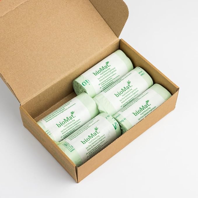 • PREMIUM QUALITY: Our bioMat compost bags with handles are entirely made of plastic-free renewable resources like Non-GMO corn starch. Worldwide proven multi-layer film technology guarantees leak-proof usage and helps to save valuable resources. bioMat 2.6 gallon compostable trash bags are free of PFAS and BPA.