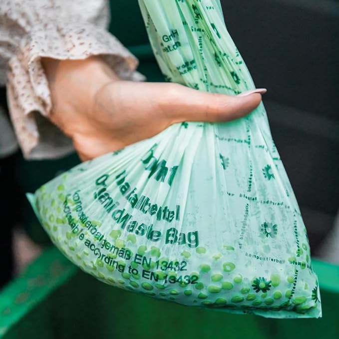 • LEAK-PROOF AND DURABLE: Our small biodegradable bags are specially designed to reduce odors commonly associated with food waste. Our bio bags with handles are designed to be leak-proof and durable due to multi-layer technology, ensuring your food waste stays contained until it's ready for composting. Our developed film technology helps compost dry faster which reduces overal weight and fruit flies. We recommend replacing the bag every 2–3 days. Let wet food dry and hot food cool before placing it in the bag.