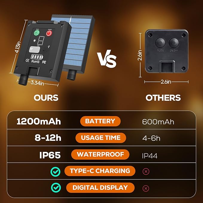 • [Larger Capacity & Longer Use Time] 1200mah large capacity solar panel, lights up for all night (15-18 hours) after fully charged; with extra USB C port (suitable for 5v adapter ), more convenient to outdoor use; modes and power display; more convenient and easy to use, suitable for all people