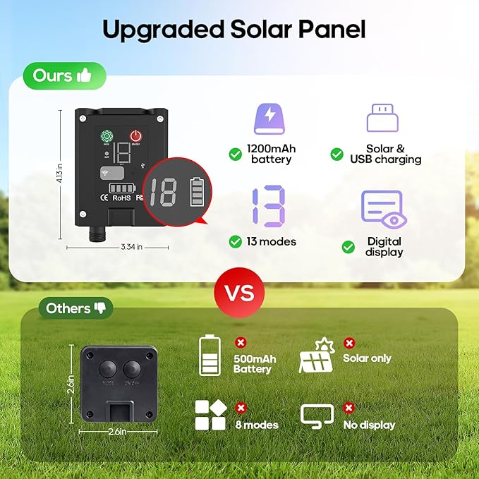 • [Larger Capacity & Longer Use Time] 1200mah large capacity solar panel, lights up for all night (15-18 hours) after fully charged; with extra USB C port (suitable for 5v adapter ), more convenient to outdoor use; modes and power display; more convenient and easy to use, suitable for all people. Total length 56 feet 100 LED, (50ft lights + 6ft extension cord)